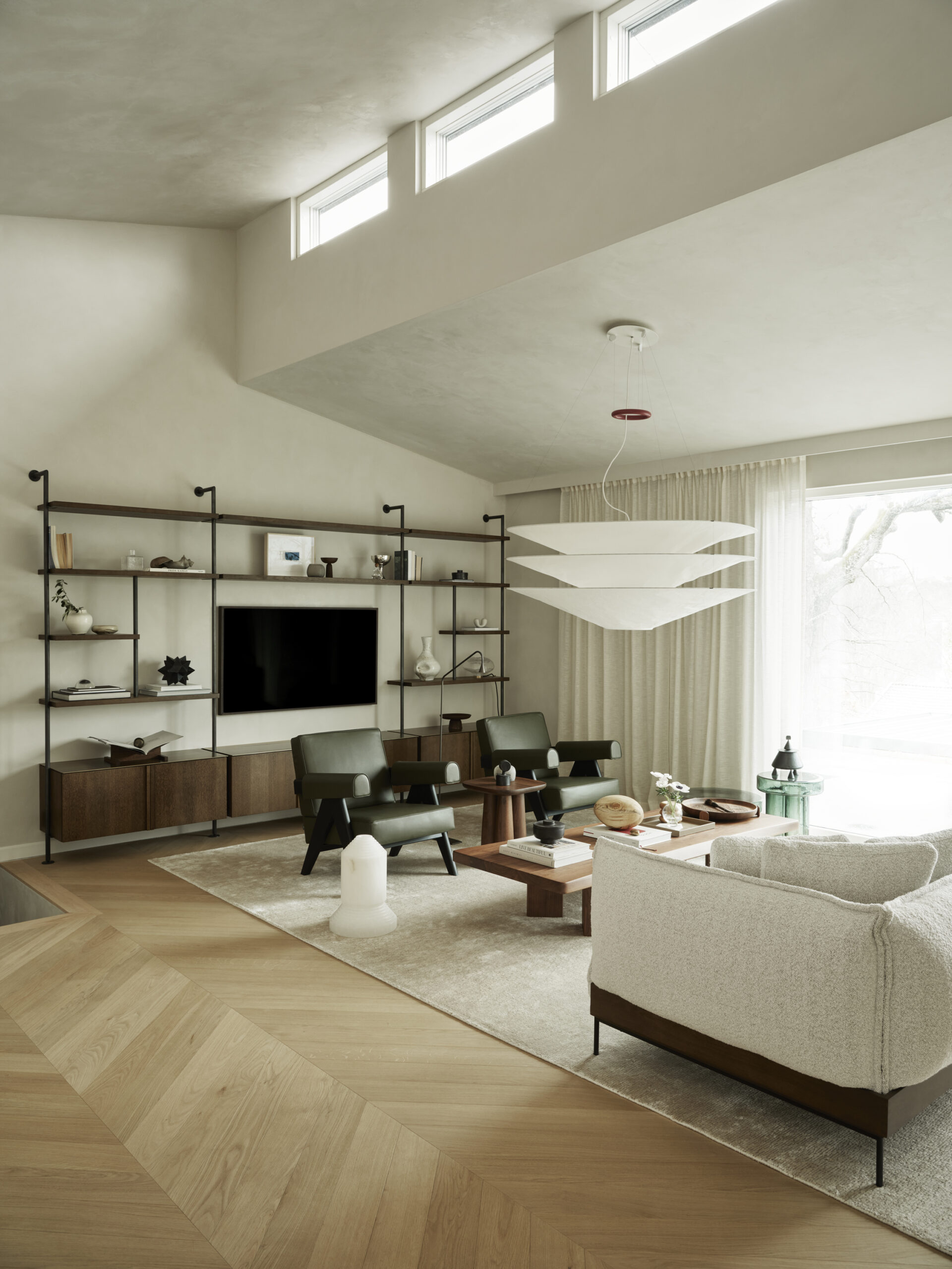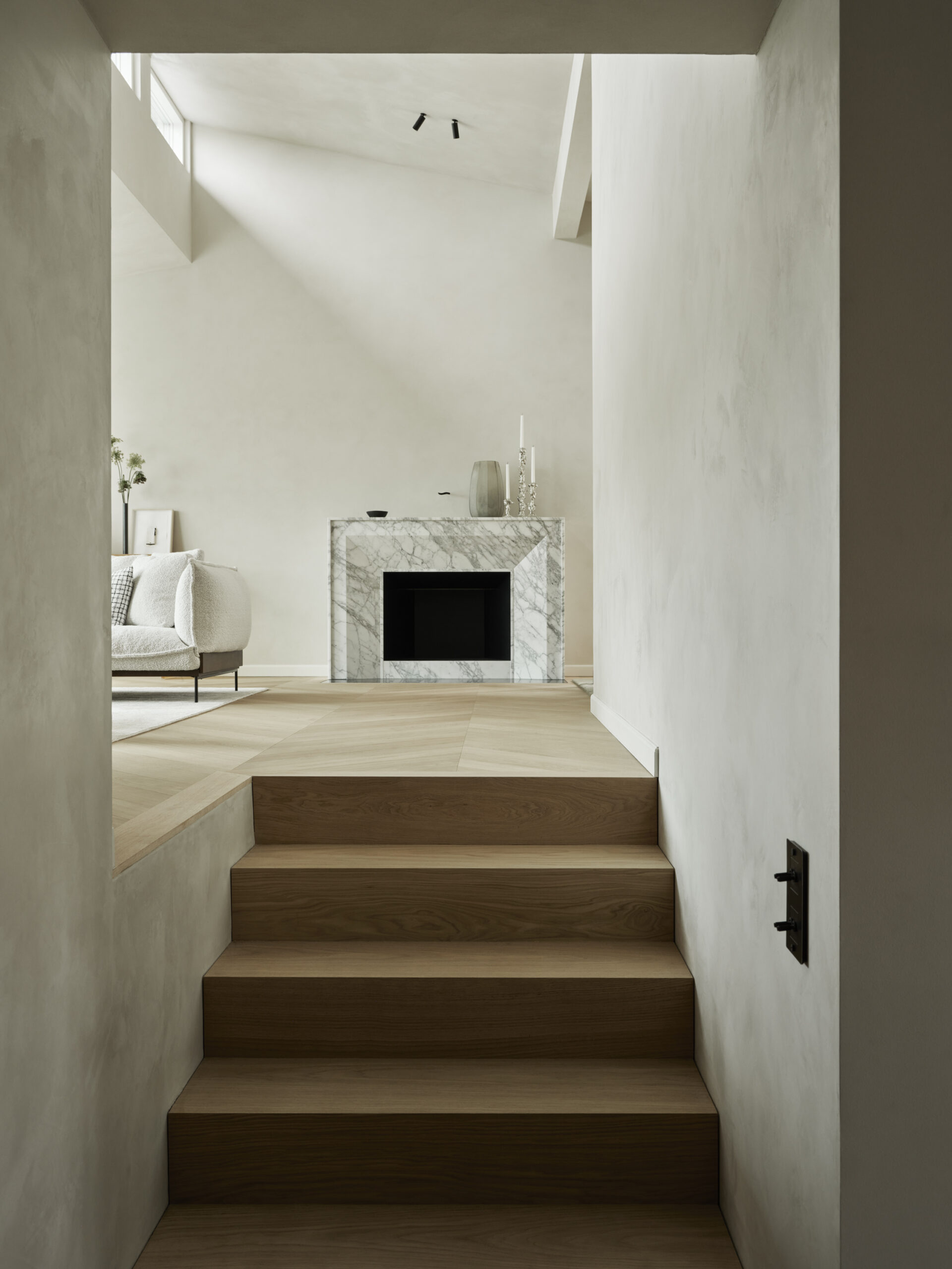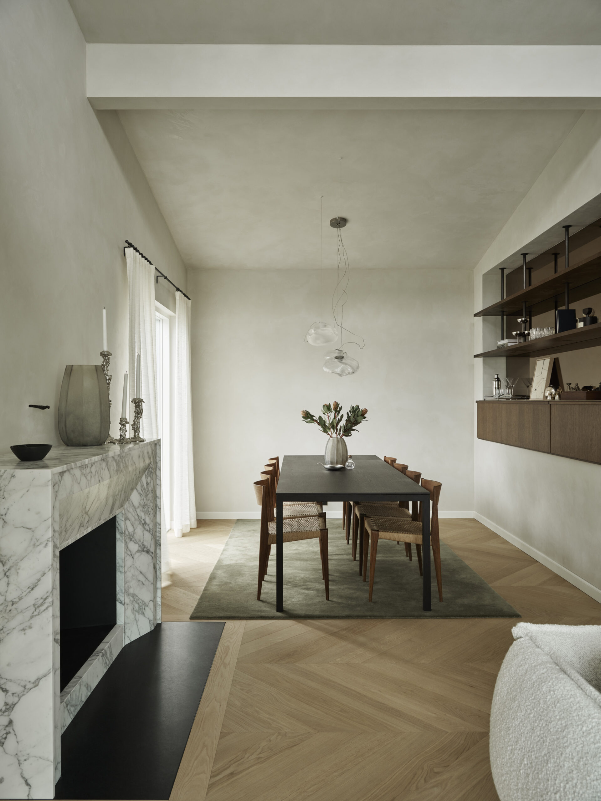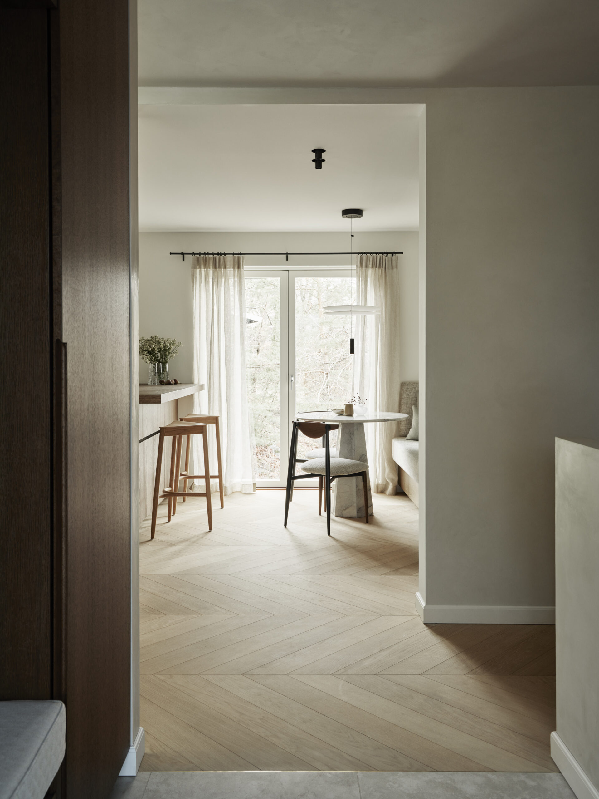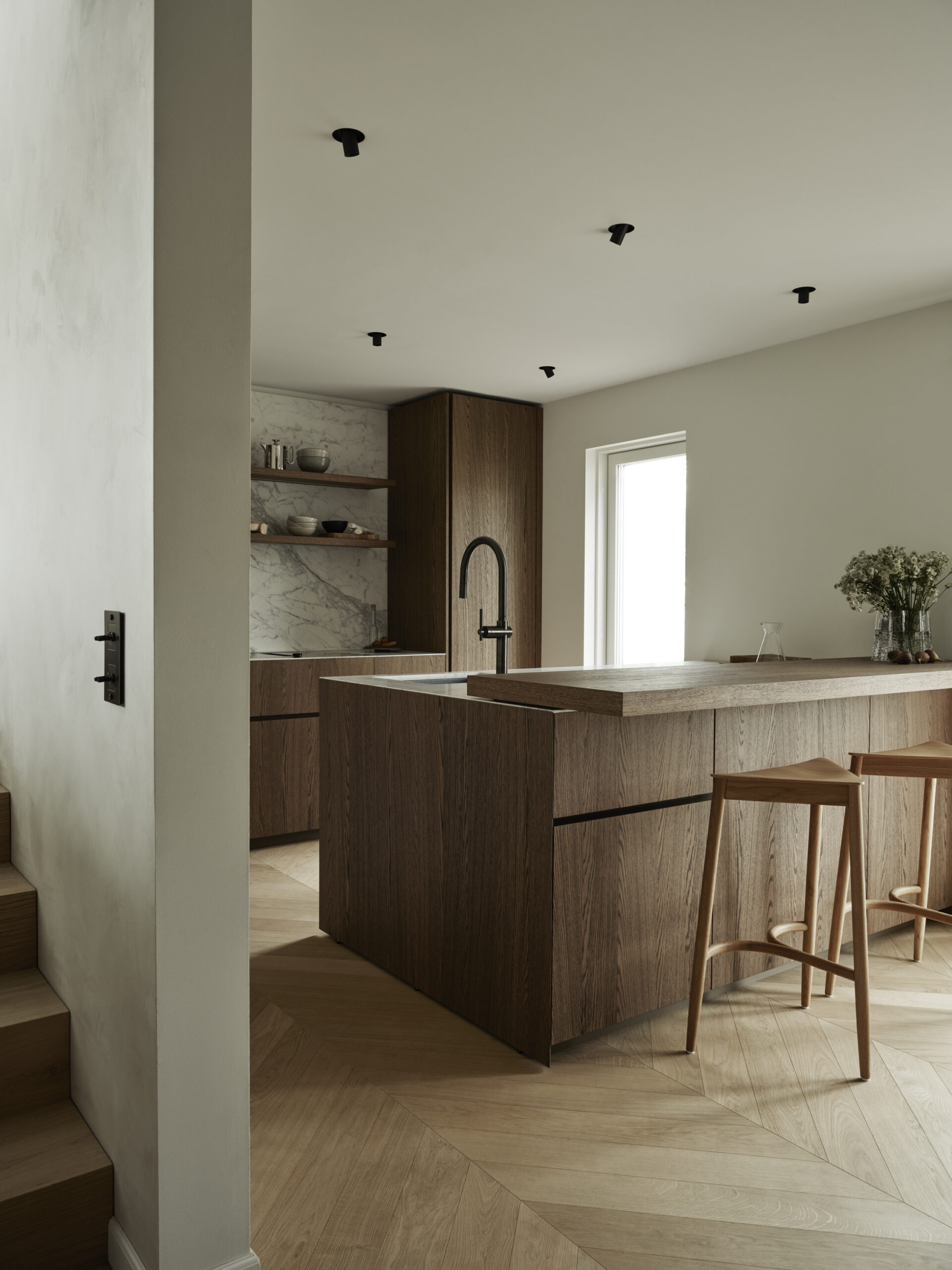 Golvet fick ett maffigt chevronmönster med extra långa plankor som förstärker känslan av rymd och tillför en lekfull detalj som lyfter interiören. Den vackra tonen och kvaliteten, som vi fann hos Chevron, harmoniserar perfekt med övriga material och skapar ett varmt och elegant intryck, berättar Ebba.